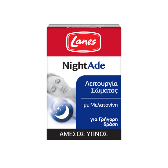 Το NightAde είναι ένα συμπλήρωμα διατροφής με μελατονίνη που βοηθάει στο φυσικό ύπνο και τη γρήγορη & άμεση μετάβαση σε αυτόν. Σε ένα μόνο δισκίο παρέχει την απαιτούμενη ποσότητα μελατονίνης (1mg) που έχει αποδειχθεί ότι συμβάλλει στη μείωση του χρόνου που χρειάζεται κάποιος για να κοιμηθεί ενώ χάρη στην καινοτομική μορφή του σε υπογλώσσια δισκία που διαλύονται γρήγορα έχει άμεση δράση με αποτέλεσμα την κορύφωση των επιπέδων της ουσίας στον οργανισμό.